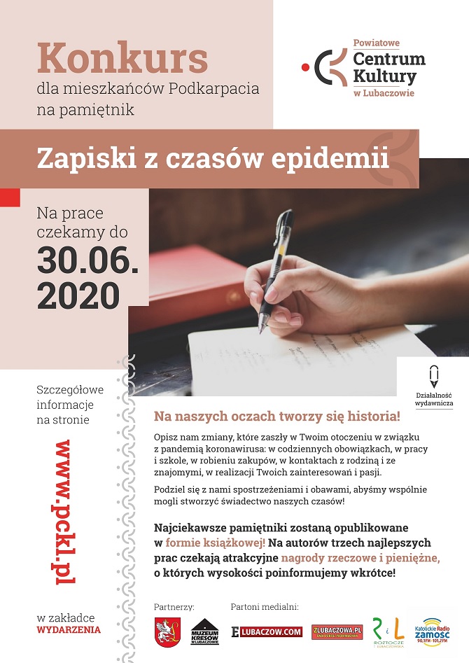 Poprzez konkurs, Powiatowe Centrum Kultury w Lubaczowie chce zachęcić mieszkańcom naszego województwa do opisania zmian, które zaszły w naszym otoczeniu w związku z pandemią koronawirusa: w codziennych obowiązkach, w pracy i w szkole, w robieniu zakupów, w kontaktach z rodziną i ze znajomymi, w przeżywaniu Świąt, w realizacji naszych zainteresowań i pasji oraz w każdej innej sferze życia.