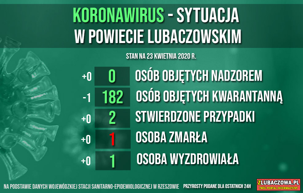 Według danych Wojewódzkiej Stacji Sanitarno-Epidemiologicznej w Rzeszowie na dzień dzisiejszy (23.04) nie ma osób objętych nadzorem epidemiologicznym (bez zmian) natomiast 182 jest poddanych kwarantannie (spadek o 1). Do tej pory stwierdzono 2 przypadki zakażenia - u młodej kobiety z gminy Stary Dzików oraz mężczyzny w średnim w wieku z gminy Wielkie Oczy. Niestety zakażona 32-letnia kobieta z gminy Stary Dzików zmarła 30 marca w szpitalu w Łańcucie. Dobra wiadomość jest taka, że wyzdrowiał mieszkaniec gminy Wielkie Oczy, który przebywał w szpitalu w Łańcucie. Zakażenie koronawirusem stwierdzono u mężczyzny 26 marca.