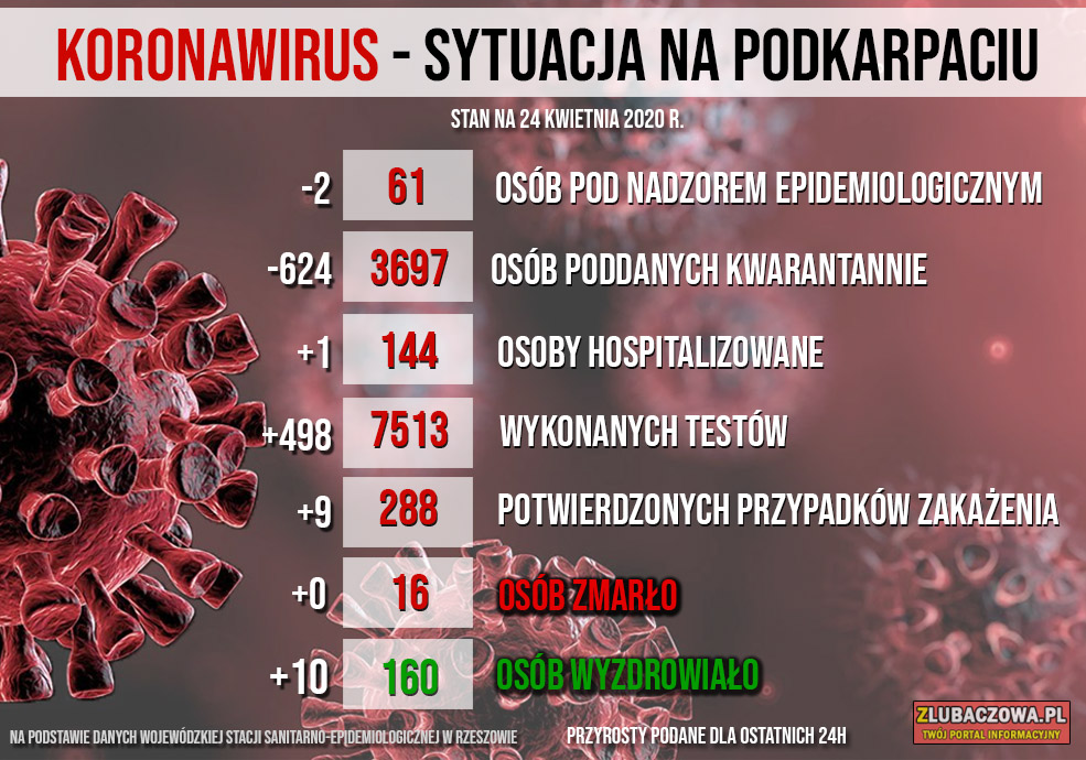 Mamy najnowsze dane dotyczące koronawirusa w naszym powiecie, na Podkarpaciu oraz w kraju. W piątek (24.04) w województwie podkarpackim potwierdzono 9 przypadków zakażenia. Wyzdrowiało 10 osób.