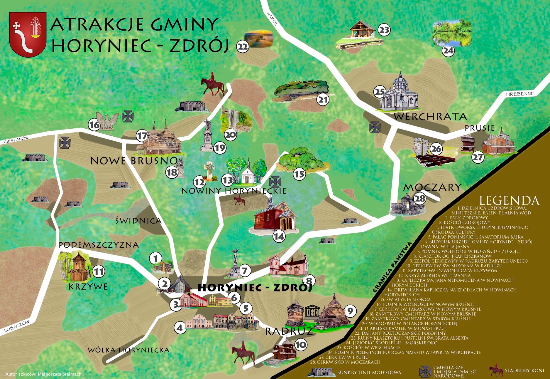 Ruszamy z nowym sezonem turystycznym i jako gmina pragniemy w przejrzysty sposób zaprezentować naszym kuracjuszom oraz licznym turystom odwiedzającym nasze tereny wszystkie atrakcje. Mapka jest odpowiedzią na ogrom pytań, jakie zawsze zadają turyści odwiedzający nasze Punkty Informacji Turystycznej. W prosty sposób wizualizuje wszystko, co warte jest zobaczenia w naszej gminie, a jak widać, jest tego bardzo dużo. Ma charakter poglądowy i do odwiedzenia niektórych miejsc warto zabrać ze sobą klasyczną mapę turystyczną. Szkice do mapki wykonała nasza lokalna artystka Małgorzata Stelmach, córka Janusza Burka. W formie papierowej będzie dostępna dla każdego do końca miesiąca w Punktach Informacji Turystycznej w Horyńcu - Zdroju. - informuje Krystian Kłysewicz