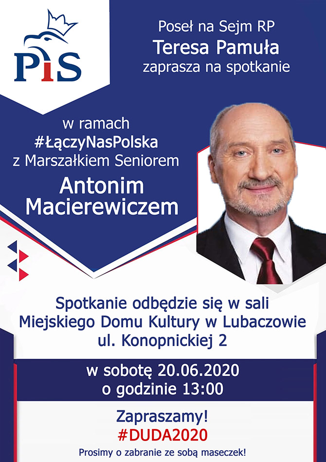 W najbliższą sobotę (20.06) w Miejskim Domu Kultury w Lubaczowie odbędzie się spotkanie z Marszałkiem Seniorem, byłym Ministrem Obrony Narodowej, Antonim Macierewiczem. Początek o godzinie 13:00.