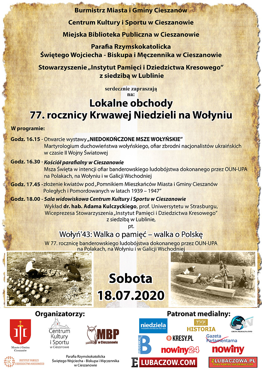 Obchody rozpoczną się o godz. 16:15 w kościele parafialnym w Cieszanowie otwarciem wystawy "NIEDOKOŃCZONE MSZE WOŁYŃSKIE. Martyrologium duchowieństwa wołyńskiego ofiar zbrodni nacjonalistów ukraińskich w czasie II wojny światowej”. Następnie zostanie odprawiona Msza Św. w intencji ofiar banderowskiego ludobójstwa dokonanego przez OUN-UPA na Polakach, na Wołyniu i w Galicji Wschodniej. O godz. 17:45 delegacje złożą kwiaty pod "Pomnikiem Mieszkańców Miasta i Gminy Cieszanów Poległych i Pomordowanych w latach 1939 - 1947. Zwieńczeniem obchodów będzie wykład dr. hab. Adama Kulczyckiego, prof. Uniwersytetu w Strasburgu, Wiceprezesa Stowarzyszenia "Instytut Pamięci i dziedzictwa Kresowego z siedzibą w Lublinie pt. „Wołyń'43: Walka o pamięć – walka o Polskę”.