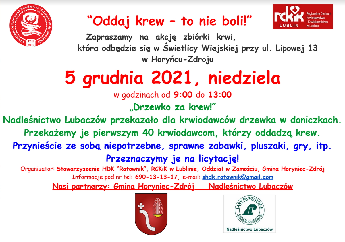 Ponadto organizatorzy: Stowarzyszenie Honorowych Dawców Krwi „Ratownik” i Regionalne Centrum Krwiodawstwa i Krwiolecznictwa w Lublinie oddział w Zamościu zachęcają do przyniesienia niepotrzebnych zabawek czy gier, które później zostaną przekazana na charytatywną licytację.