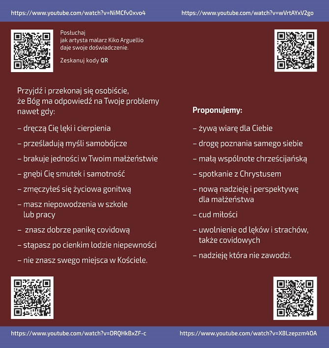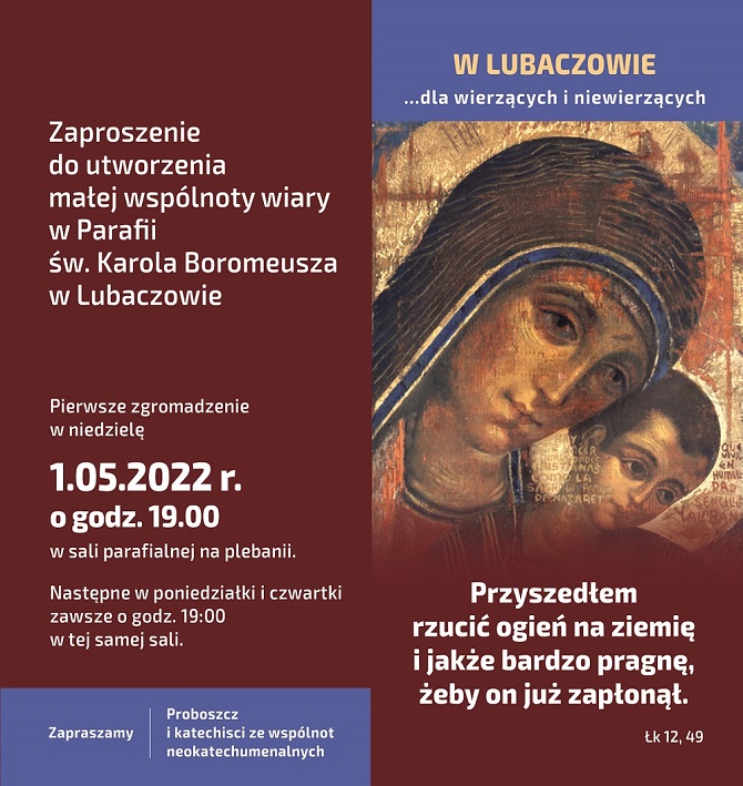 - Już w najbliższą niedzielę 1 maja na rynku w Lubaczowie, od godziny 11.00 rozpocznie się wydarzenie ewangelizacyjne. Zapraszamy wszystkich, szczególnie młodzież, bo swoim doświadczeniem obecności Boga w życiu będą się dzielili młodzi, którzy przyjadą do Lubaczowa głosić mi łość Boga do każdego człowieka. Natomiast wieczorem, o godzinie 19.OO w Parafii św. Karola Boromeusza rozpocznie się cykl katechez dla młodzieży i dorosłych. Kolejne spotkania w poniedziałki i czwartki o 19.00. Szczegóły na plakatach. - zapraszają proboszcz i katechiści ze wspólnot neokatechumenalnych.