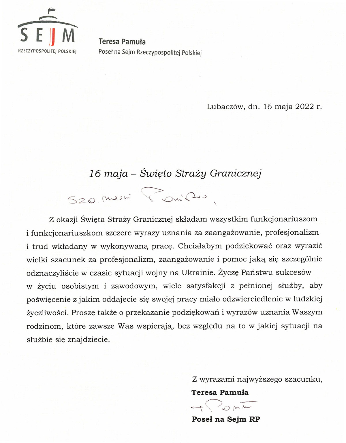 Dzisiaj (16.05) obchodzimy Święto Straży Granicznej. Z tej okazji Poseł Teresa Pamuła złożyła życzenia wszystkim funkcjonariuszom i funkcjonariuszkom SG.