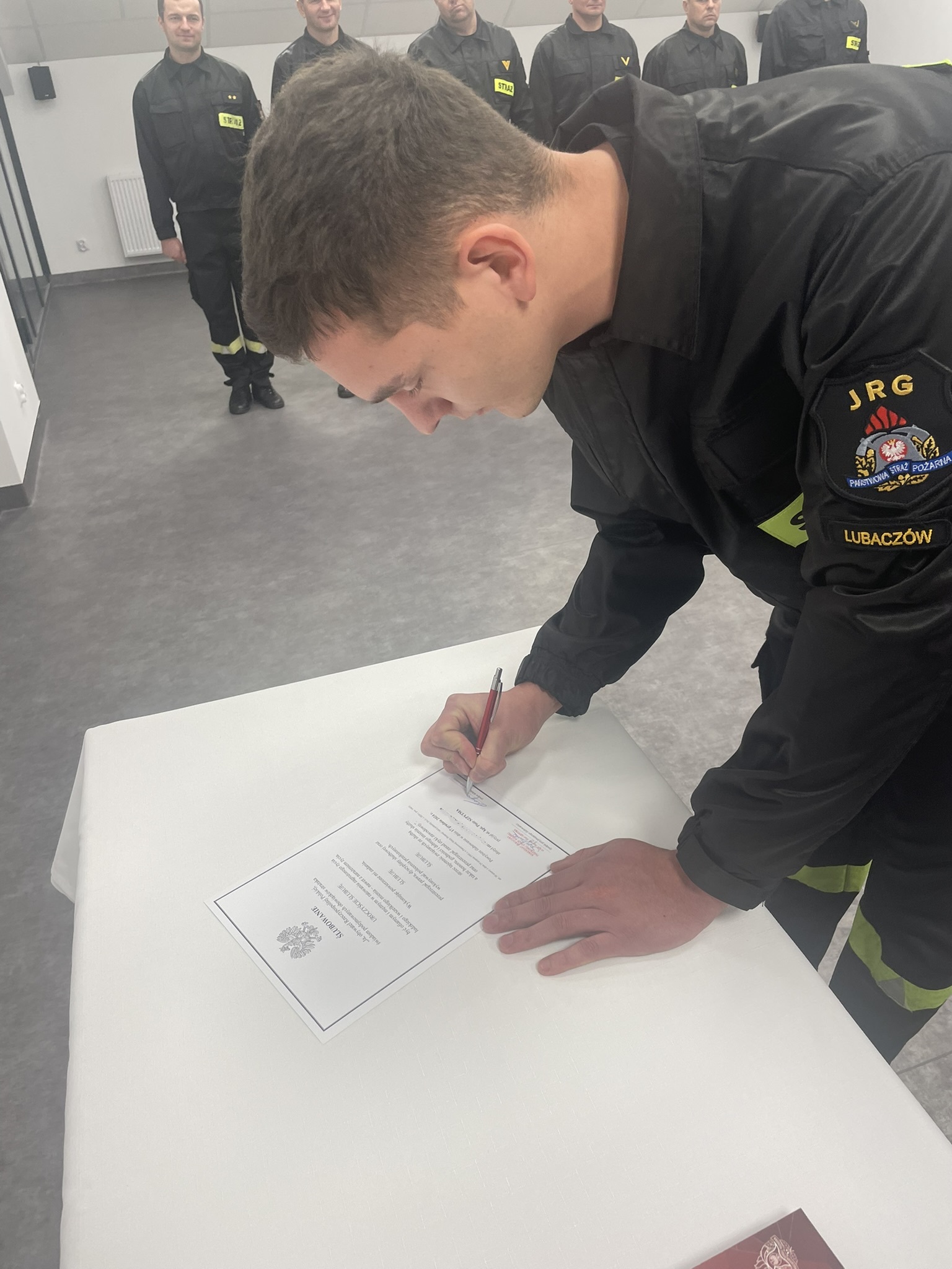 17 grudnia 2024 r. w Komendzie Powiatowej Państwowej Straży Pożarnej w Lubaczowie odbyła się uroczysta zbiórka, podczas której nowy funkcjonariusz, str. Kacper Jastrzębski, złożył rotę ślubowania. W obecności Komendanta Powiatowego PSP, st. kpt. Piotra Szpytmy, oraz zgromadzonych funkcjonariuszy i pracowników cywilnych zabrzmiały słowa przysięgi, które są symbolem oddania i gotowości do służby.