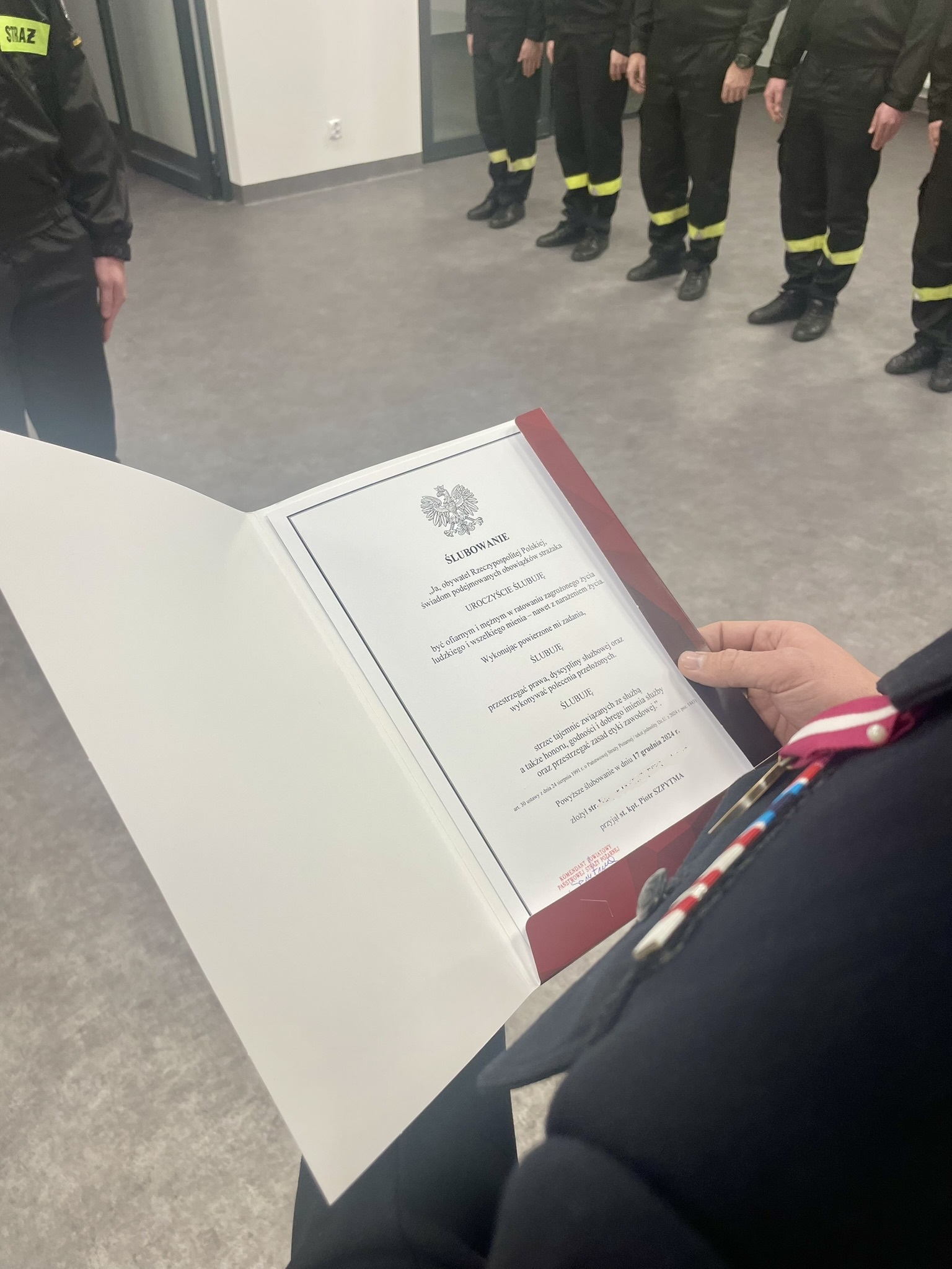 „Ja, obywatel Rzeczypospolitej Polskiej, świadom podejmowanych obowiązków strażaka, uroczyście ślubuję być ofiarnym i mężnym w ratowaniu zagrożonego życia ludzkiego i wszelkiego mienia - nawet z narażeniem życia. (…)” – słowa te wybrzmiały z pełnym zaangażowaniem, podkreślając wagę obowiązków, jakie wiążą się z pełnieniem służby w Państwowej Straży Pożarnej.