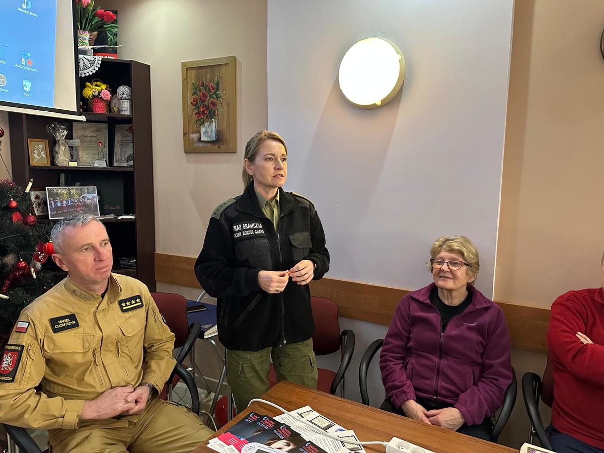 Kpt. Ewelina Gajewska ze Straży Granicznej przybliżyła seniorom charakter służby pełnionej na wschodniej granicy. Opowiadała o codziennych obowiązkach funkcjonariuszy, wykorzystywanym sprzęcie oraz zadaniach związanych z ochroną zewnętrznej granicy Unii Europejskiej. Uczestnicy spotkania z zainteresowaniem słuchali o pracy formacji, z którą na co dzień rzadko mają bezpośredni kontakt.