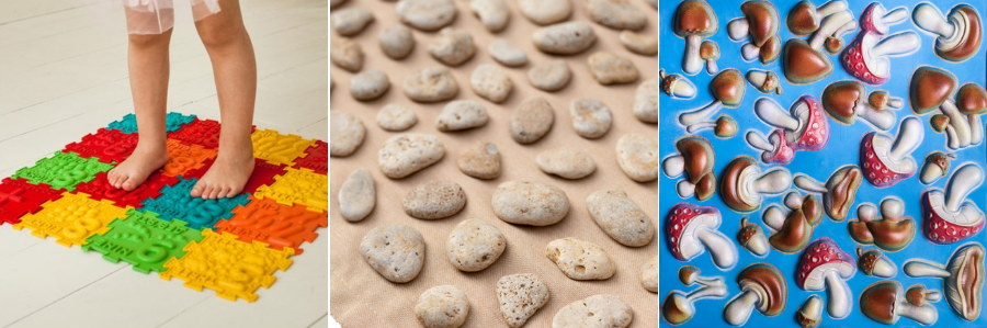 Mata sensoryczna. Mata sensoryczna z różnymi fakturami pobudza stopy receptory dotykowe i wpływa pozytywnie na rozwój sensoryczny. Taką matę kupisz m. in. w firmie Ortek.