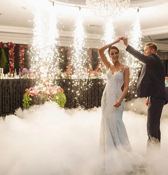 Fontanna iskier to urządzenie sceniczne tworzące pionową kaskadę jasnych, migoczących iskier. W nowoczesnych rozwiązaniach stosuje się technologię tzw. zimnych iskier, dzięki czemu efekt jest bardziej przewidywalny i – co ważne dla Par Młodych – może być wykorzystywany również w pomieszczeniach (o ile pozwala na to regulamin obiektu). Iskry unoszą się ku górze, tworząc „świetlną ramę” wokół tańczących, a cały pokaz można dopasować do klimatu wesela: od delikatnego złotego blasku po intensywniejsze, srebrzyste iluminacje.