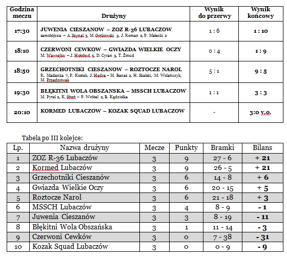 W trzeciej kolejce Ligii Halowej Piłki Nożnej w Cieszanowie padło w sumie 41 bramek. Pierwsze miejsce zajmuje ZOZ R-36 Lubaczów z dorobkiem 9 punktów. Na drugim miejscu znajduje się Kormed Lubaczów. Zobacz wyniki oraz aktualną tabelę.
