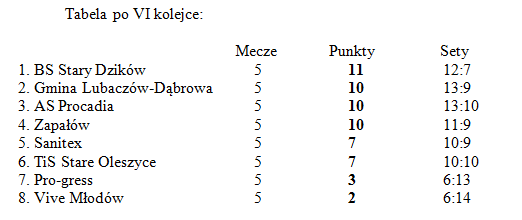 W sobotę 10.01.2015 na hali sportowej przy Zespole Szkół w Lubaczowie odbyła się VI kolejka Amatorskiej Ligi Piłki Siatkowej. Liderem jest zespół BS Stary Dzików, ostatnie miejsce zajmuje Vive Młodów.