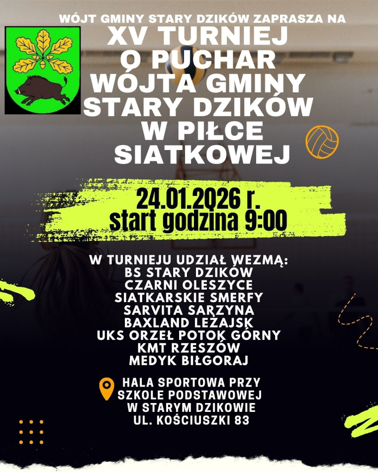 W Starym Dzikowie po raz piętnasty rozegrany zostanie Turniej o Puchar Wójta Gminy Stary Dzików w piłce siatkowej. Zawody odbędą się w sobotę, 24 stycznia 2026 roku, a pierwszy gwizdek zabrzmi o godzinie 9:00.