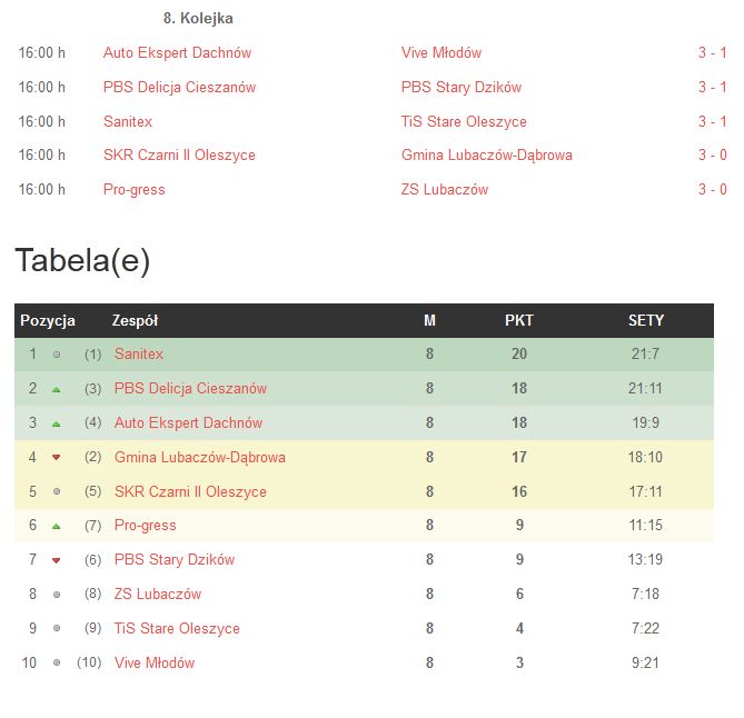 Sanitex, PBS Delicja Cieszanów oraz Auto Expert Dachnów - te drużyny bez większych problemów powinny się zakwalifikować do najlepszej czwórki ALPS. W ostatniej kolejce wymienione wyżej zespoły pokonały swoich rywali wynikiem 3-1. Przypomnijmy, że siatkarskie drużyny, które zajmują pozycje 1 - 4 awansują do fazy play off, w której będą walczyć o mistrzostwo. Niesamowicie ciekawie zapowiada się walka o 4 miejsce SKR Czarni II Oleszyce i Gminy Lubaczów - Dąbrowa. Wczoraj obie drużyny zagrały "mecz na szczycie", w którym lepsi okazali się młodzi siatkarze z Oleszyc pokonując doświadczoną Dąbrowa 3:0! Teraz te drużyny czeka zacięta walka o 4 miejsce. Aby włączyć się do walki o mistrzostwo obie ekipy muszą wygrać mecze w kolejnej kolejce. Łatwiejsze zadanie mają Czarni - grają z zespołem Vive Młódów, który zajmuje aktualnie ostatnie miejsce. Dąbrowa zagra z Pro-gressem, który plasuje się na 6 pozycji. 3 drużyny, które są aktualnie w pierwszej trójce powinny bez większych kłopotów wygrać swoje mecze, bo grają z ekipami, które są niżej w tabeli.