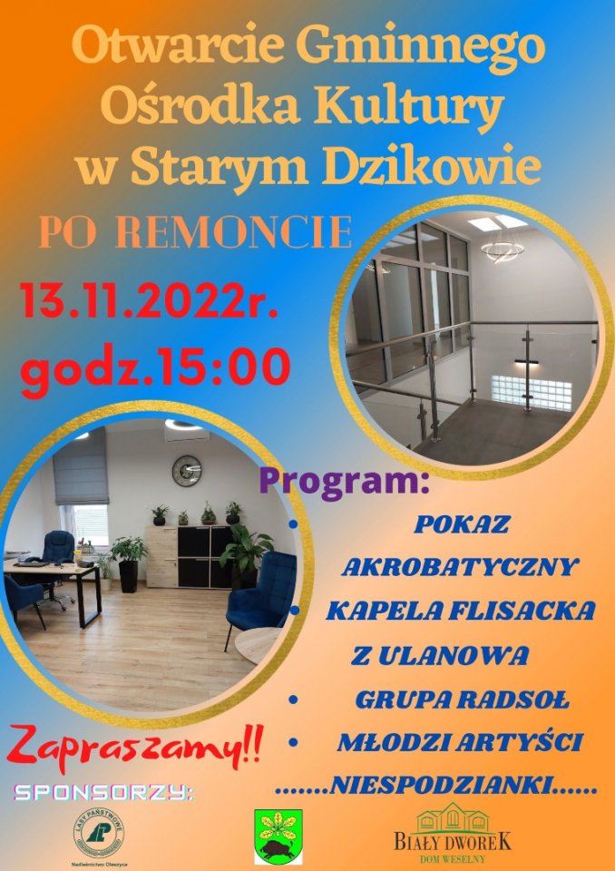 Oficjalne otwarcie wyremontowanego GOKu w Starym Dzikowie odbędzie się w niedzielę 13 listopada o godz. 15:00. W programie pokaz akrobatyczny, występ Kapeli Flisackiej z Ulanowa, Grupy Radsoł oraz młodych artystów z gminy Stary Dzików. Organizatorzy wydarzenia przygotowali też dla uczestników niespodzianki.
