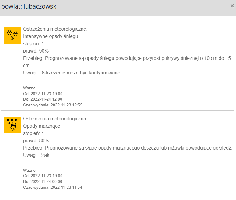 IMGW wydało dwa ostrzeżenia dla powiatu lubaczowskiego. Pierwsze dotyczy intensywnych opadów śniegu: