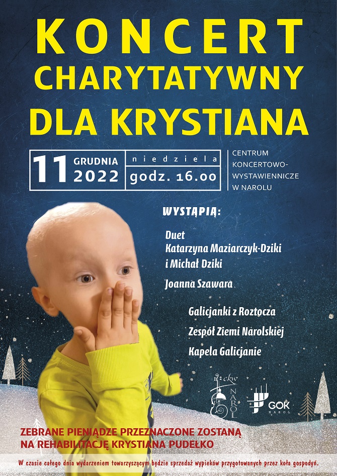 11 grudnia o godz. 16:00 w Centrum Koncertowo-Wystawienniczym w Narolu obędzie się koncert charytatywny dla Krystiana. Wystąpią Duet Katarzyna Maziarczyk-Dziki i Michał Dziki, Joanna Szawara, Galicjanki z Roztocza, Zespół Ziemi Narolskiej oraz Kapela Galicjanie. Zebrane pieniądze przeznaczone zostaną na rehabilitację Krystiana.