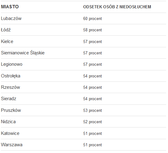 Najgorsze wyniki w poszczególnych miastach, czyli największy procent osób z niedosłuchem powyżej 50 procent przebadanych