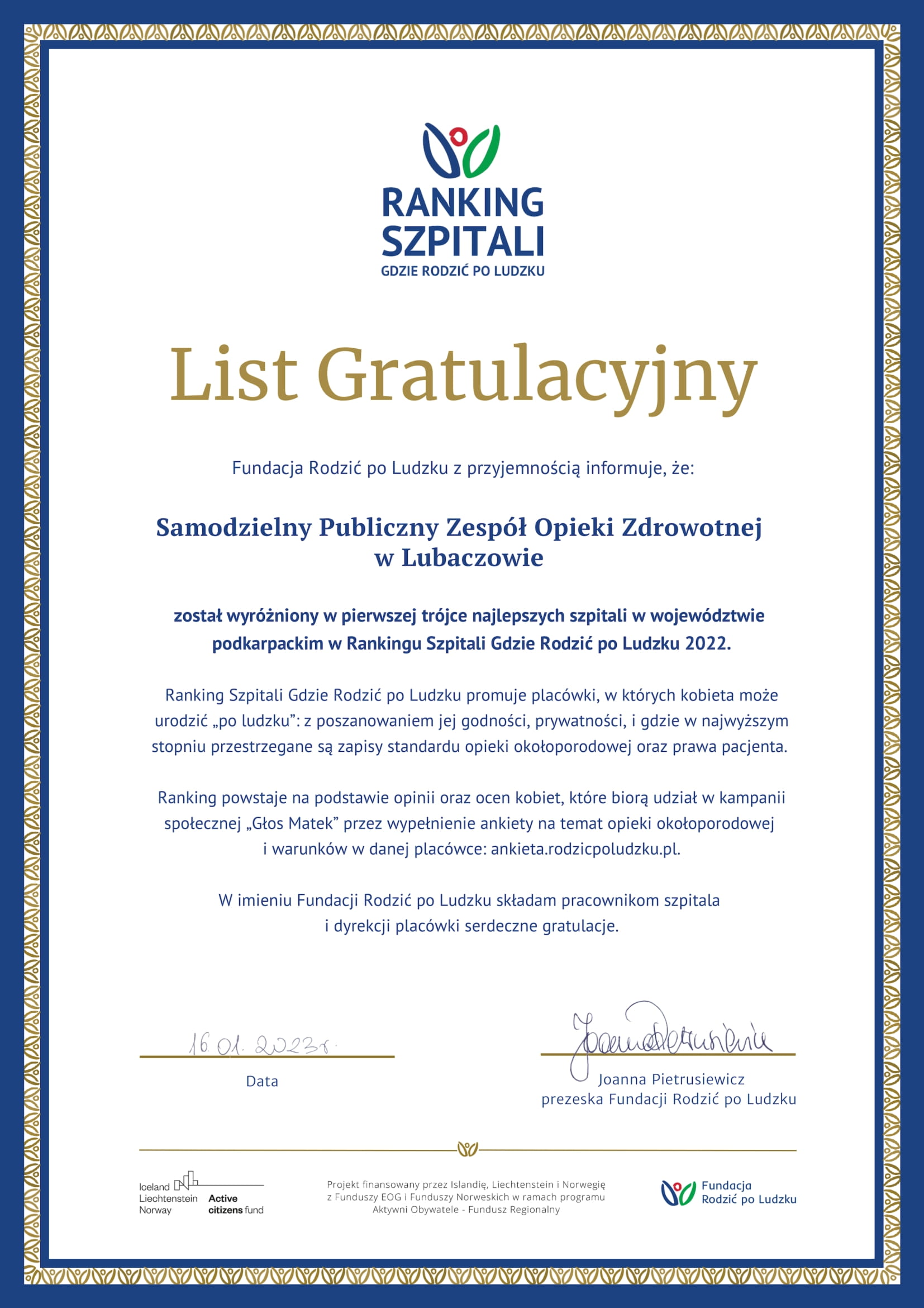 Fundacja Rodzić Po Ludzku to organizacja działająca na rzecz kobiet w ciąży i matek małych dzieci, która od ponad 20 lat monitoruje placówki położnicze pod kątem respektowania przez nie prawa kobiet w opiece okołoporodowej. Od lutego 2018 r. fundacja w sposób ciągły zbiera dane w ramach akcji "Głos matek ma moc zmiany" poprzez ankiety wypełniane przez kobiety, które urodziły siłami natury bądź przez cięcie cesarskie. Pytania zawarte w kwestionariuszu dotyczą m.in. przygotowania do porodu, doświadczeń z izby przyjęć, sali porodowej i pobytu na oddziale położniczym, a także relacji z personelem medycznym, oceny warunków oraz opieki.