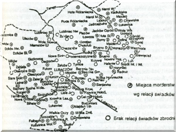 Według szacunków polskich historyków ukraińscy nacjonaliści zamordowali około 100 tysięcy Polaków. 40-60 tysięcy zginęło na Wołyniu, 20-40 tys. w Galicji Wschodniej. Na ziemi lubaczowskiej w latach 1944-1947 z rąk OUN-UPA zginęło ponad 3500 osób, z czego dokładne okoliczności śmierci ustalono w przypadku 1621 ofiar. Poniżej znajduje się mapka działalności Ukraińskiej Powstańczej Armii: