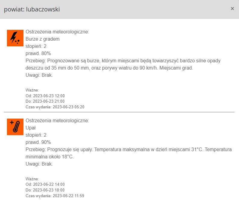Instytut Meteorologii i Gospodarki Wodnej ostrzega, że na terenie powiatu lubaczowskiego mogą wystąpić burze z gradem. Wydano także ostrzeżenie dotyczące upału.