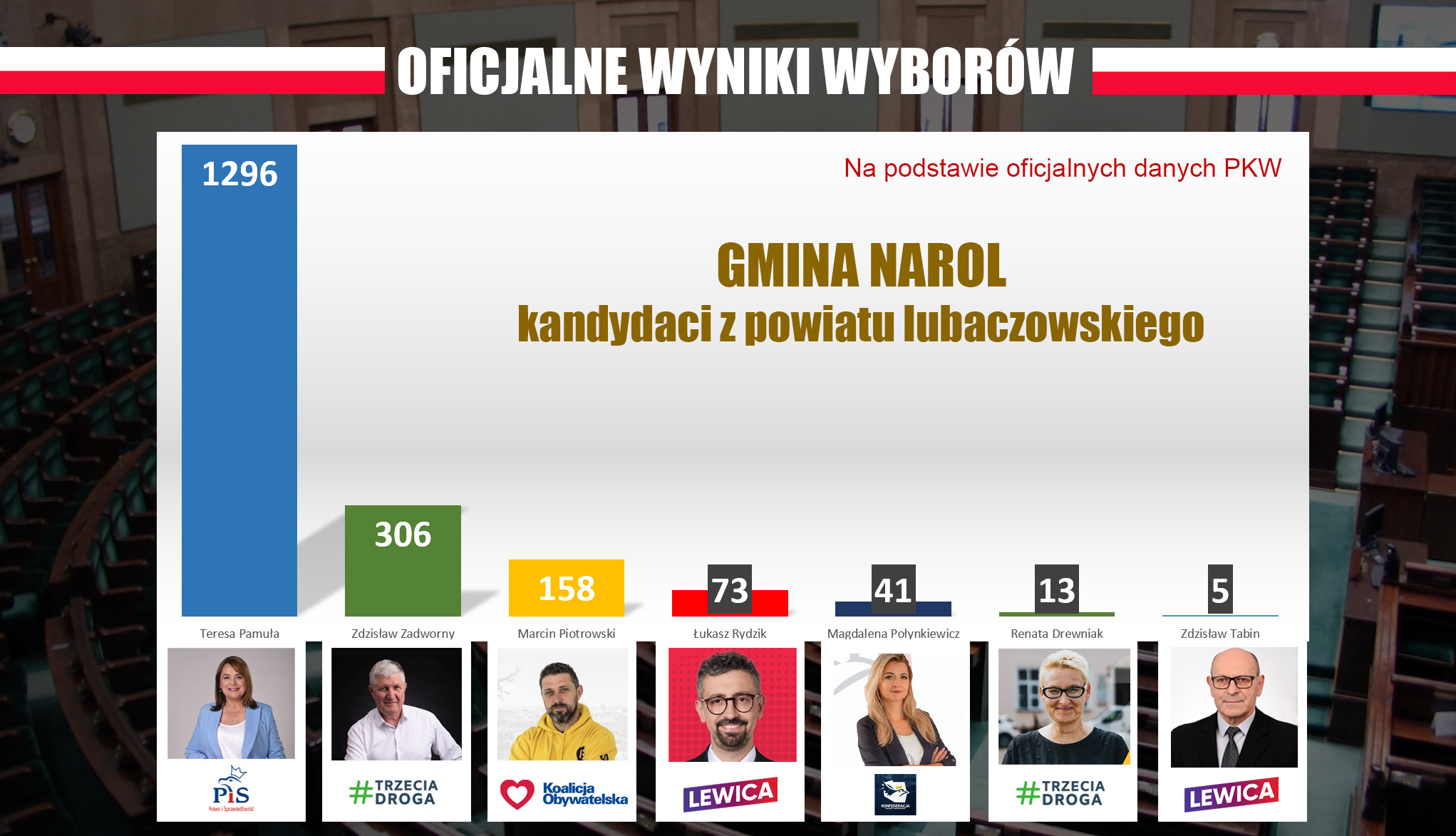 Wyniki wyborów - liczba głosów na kandydatów z powiatu lubaczowskiego w Gminie Narol