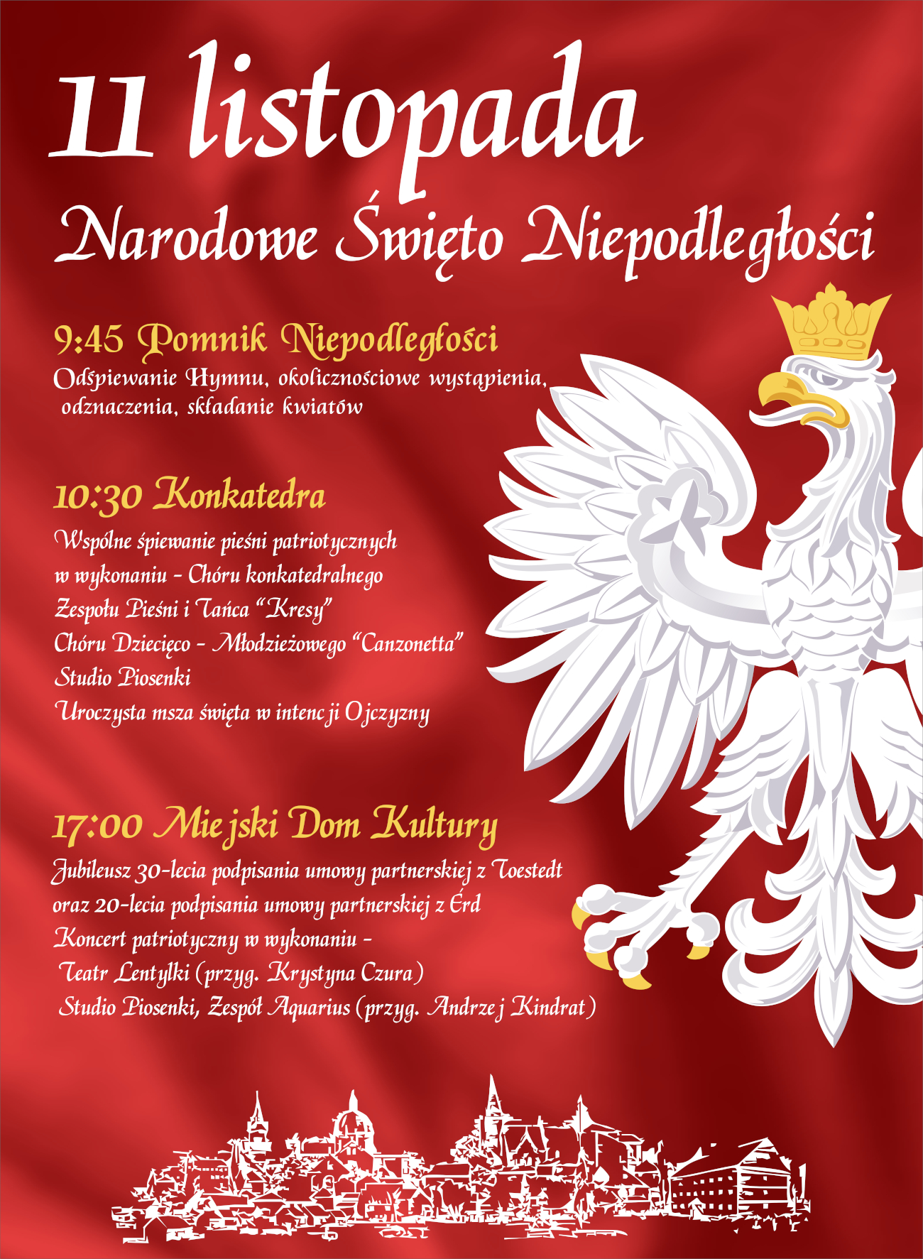 Tegoroczne obchody Narodowego Święta Niepodległości w Lubaczowie będą wyjątkowe, ponieważ po godzinie 17:00 w Miejskim Domu Kultury rozpocznie się jubileusz 30-lecia podpisania umowy partnerskiej z niemieckim miastem Toestedt oraz 20-lecie podpisania umowy partnerskiej z węgierskim Erd. Na koniec koncert patriotyczny w wykonaniu Teatru Lentylki, Studia Piosenki oraz Zespołu Aquarius.