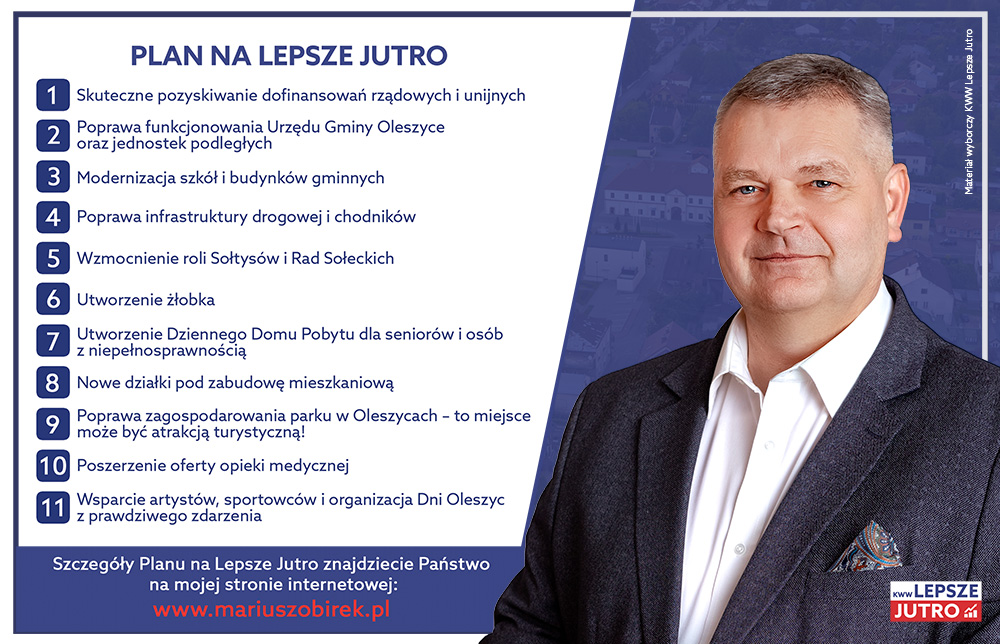 Mariusz Obirek – kandydat na burmistrza Miasta i Gminy Oleszyce zaprezentował swój program wyborczy – Plan na Lepsze Jutro. Opiera się on na 11 punktach, a jego głównym zamierzeniem jest znaczna poprawa jakości życia w gminie Oleszyce.