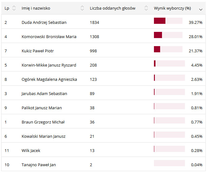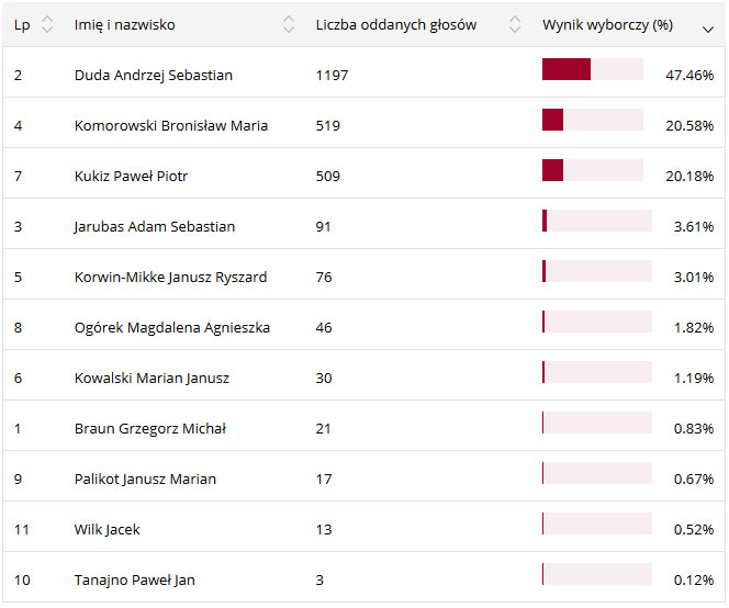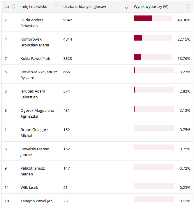 Pozostali kandydaci uzyskali słabe poparcie wśród mieszkańców powiatu. Poniżej tabela z wynikiem poszczególnych kandydatów w powiecie lubaczowskim: