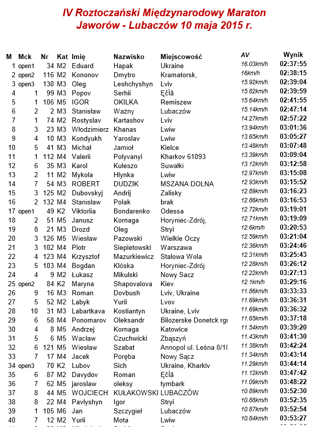 Drugi na mecie pojawił się Kononov Dmytro, który trasę 42 kilometrów przebiegł w czasie 02:38:15. Trzecie miejsca zajął Oleg Leshchyshyn, który osiągnął czas 02:39:04.