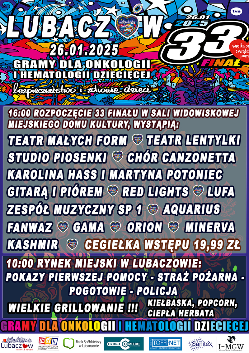 W Lubaczowie 26 stycznia 2025 roku odbędzie się 33. Finał Wielkiej Orkiestry Świątecznej Pomocy. Tegoroczny finał poświęcony jest wsparciu onkologii i hematologii dziecięcej pod hasłem „Bezpieczeństwo i zdrowie dzieci”.