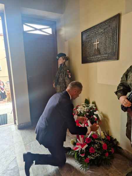 Na zakończenie uroczystości, przy pamiątkowej tablicy znajdującej się przy świątyni, odbyło się symboliczne złożenie wiązanek przez przybyłe delegacje.
