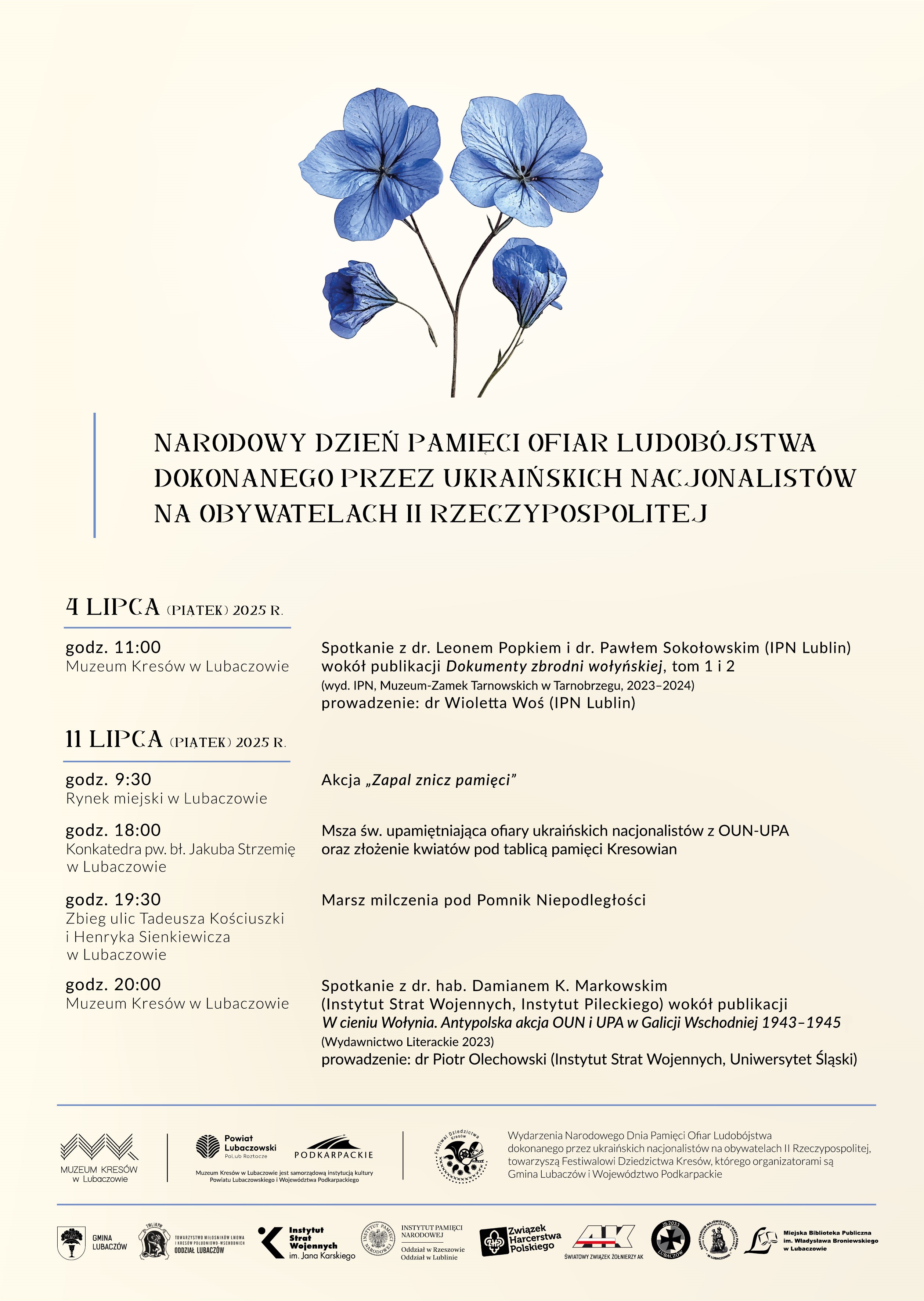 Muzeum Kresów w Lubaczowie zaprasza do udziału w obchodach Narodowego Dnia Pamięci Ofiar Ludobójstwa dokonanego przez ukraińskich nacjonalistów na obywatelach II Rzeczypospolitej. Wydarzenia upamiętniające tragiczne losy Polaków na Kresach Wschodnich zaplanowano na 4 i 11 lipca 2025 r. w Lubaczowie.