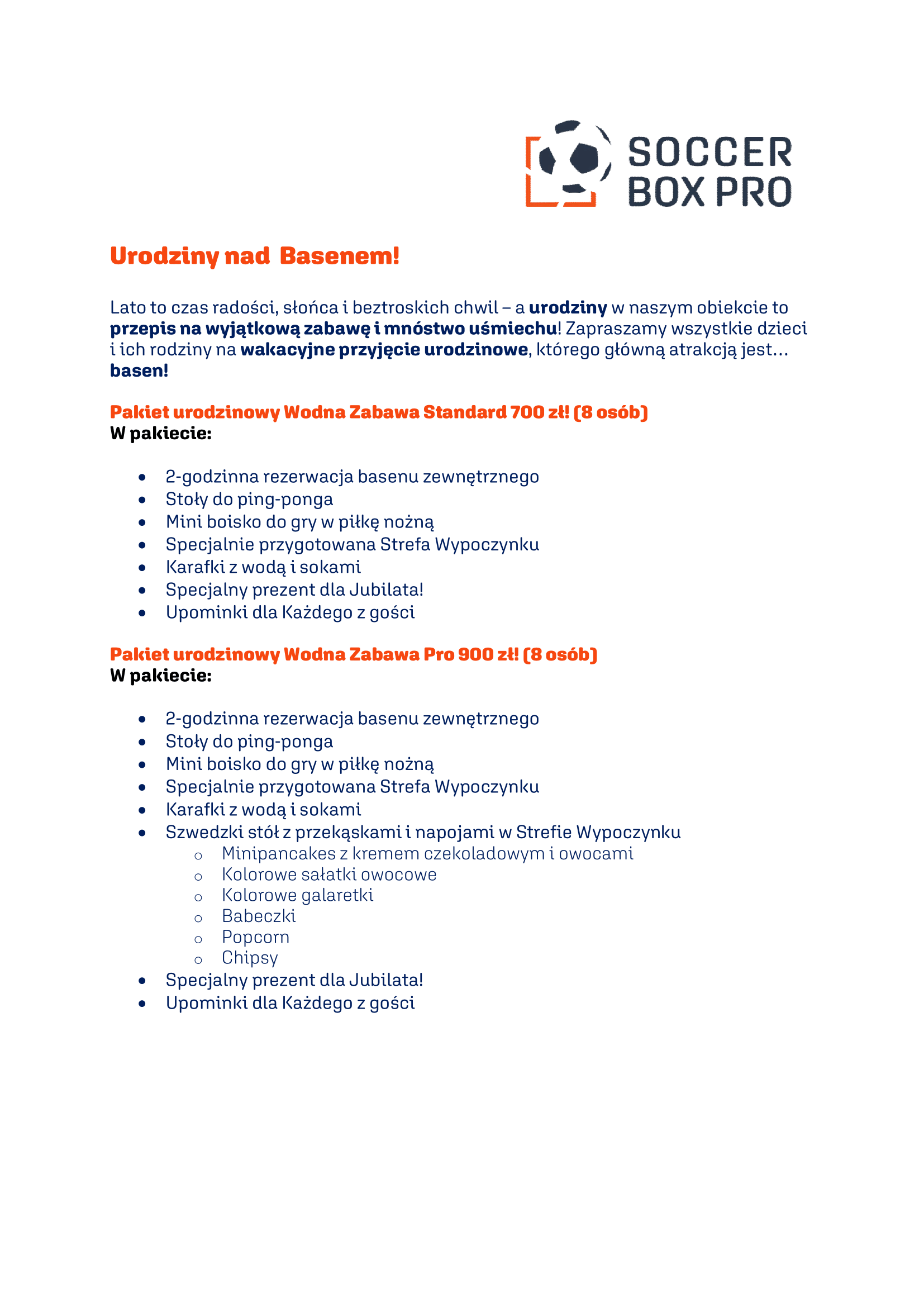 Istnieje możliwość połączenia obu wariantów – urodzin na boisku i nad wodą – w jedno wyjątkowe wydarzenie. Taki pakiet wyceniany jest indywidualnie, po wcześniejszym kontakcie z organizatorem.