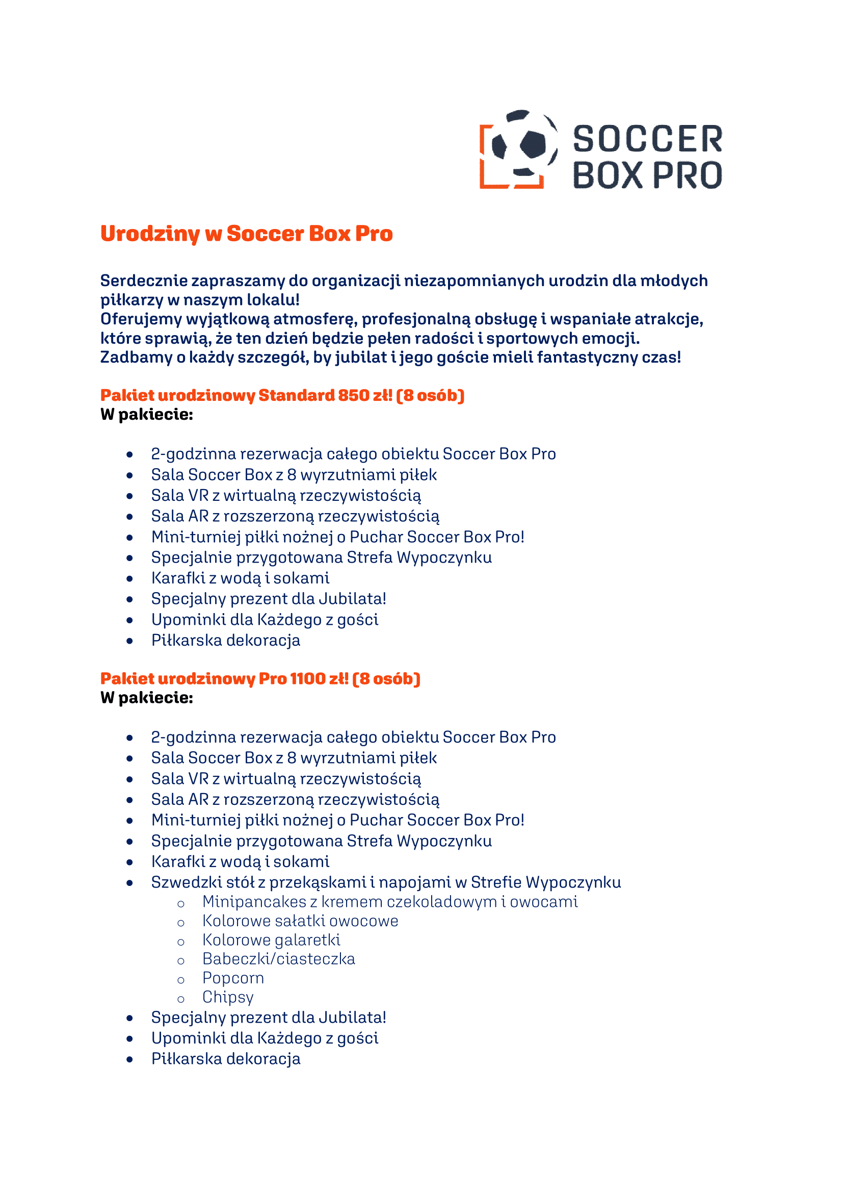 Dla fanów piłki nożnej Soccer Box Pro przygotował przestrzeń, w której można przeżyć urodzinową przygodę pełną emocji, rywalizacji i nowoczesnych technologii. Wśród dostępnych atrakcji znajdują się: