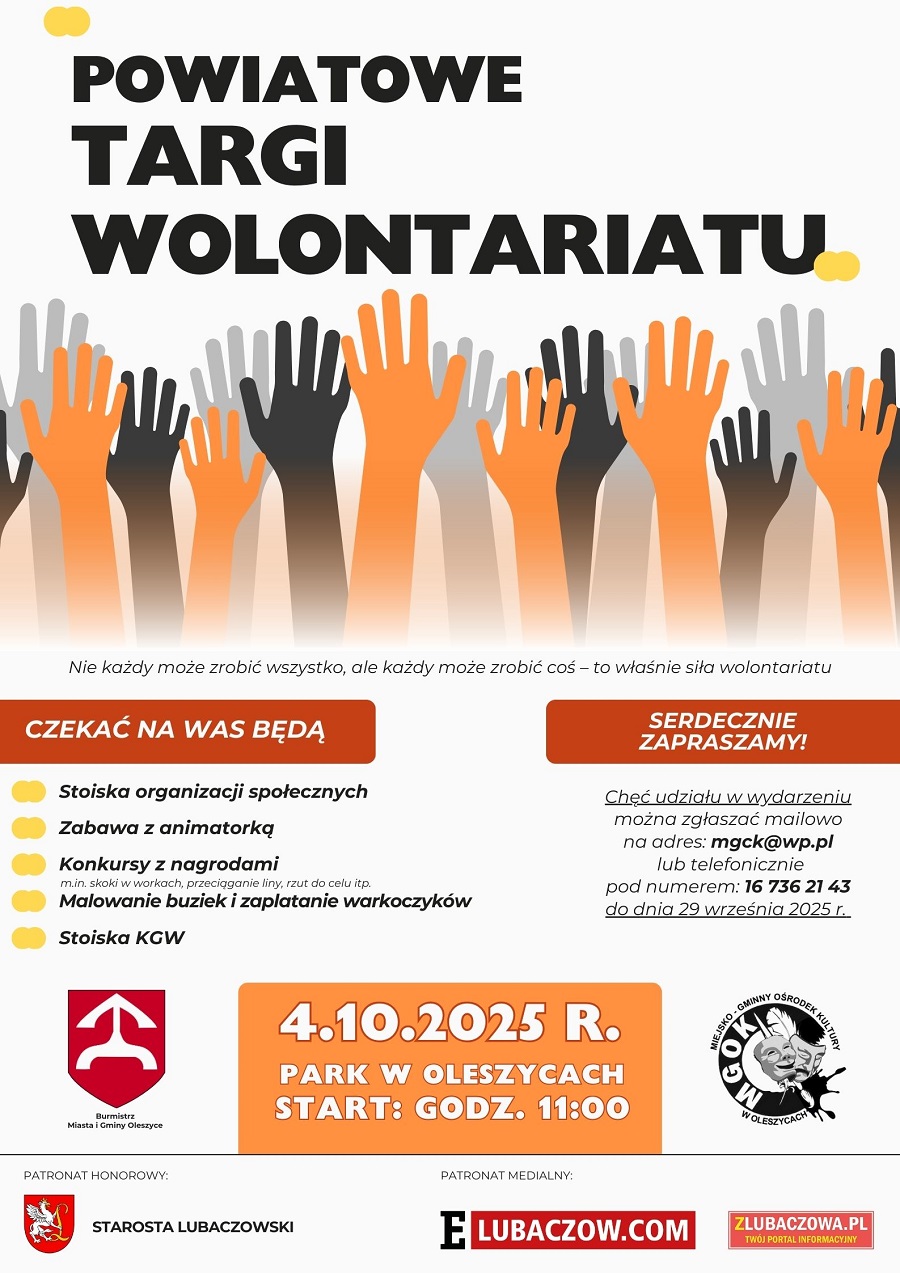 W pierwszą sobotę października park w Oleszycach stanie się miejscem spotkania osób, które swoją energią, pomysłami i zaangażowaniem zmieniają lokalną społeczność. Powiatowe Targi Wolontariatu odbędą się 4 października 2025 r., a ich początek zaplanowano na godzinę 11:00.