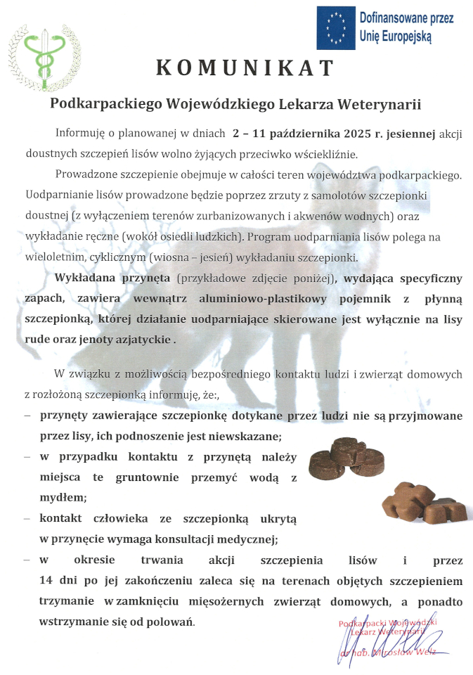 Mieszkańcy powiatu lubaczowskiego otrzymali dzisiaj Alert Rządowego Centrum Bezpieczeństwa informujący o rozpoczęciu jesiennej akcji szczepienia lisów wolno żyjących przeciwko wściekliźnie. Działania prowadzone będą w dniach 2–11 października 2025 roku na terenie całego województwa podkarpackiego.