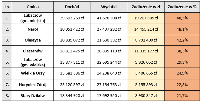 Rok temu Narol był w poważnych finansowych tarapatach. Gmina ta przekroczyła ustawowy limit 60% zadłużenia, co groziło poważnymi problemami. Na szczęście w 2014 roku dochody owej gminy były większe niż wydatki, co zmniejszyło zadłużenie do 48,1%. Na pierwszym miejscu w rankingu znajduje się Lubaczów z zobowiązaniami finansowymi na poziomie 48%. Rok temu tamtejsza gmina wydała ponad 41 milinów złotych, a 2 miliony mniej uzyskała dochody. Wśród najbardziej zadłużonych gmin znajdują się także Oleszyce, które w dalszym ciągu zalegają prawie 9 milionów złotych.