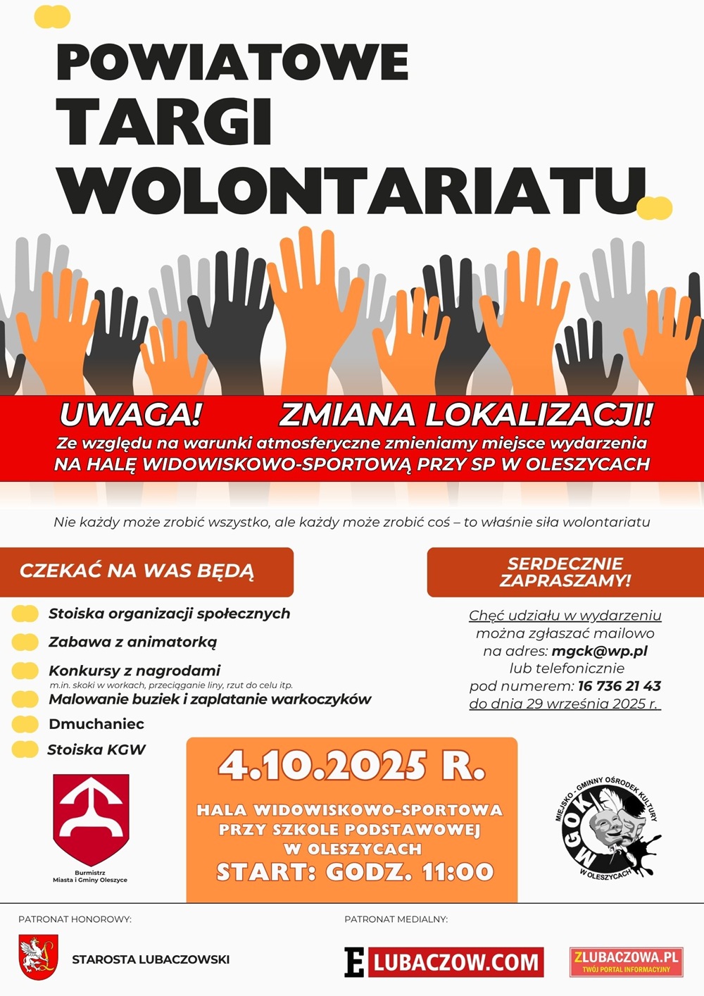 Ze względu na niesprzyjające warunki pogodowe organizatorzy Powiatowych Targów Wolontariatu poinformowali o zmianie lokalizacji wydarzenia. Spotkanie odbędzie się w sobotę, 4 października, w hali widowiskowo-sportowej przy Szkole Podstawowej w Oleszycach. Początek zaplanowano na godzinę 11:00.