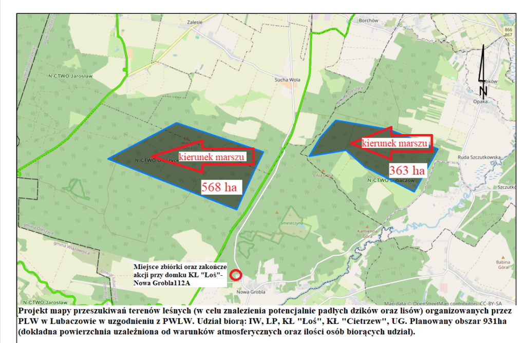 W akcji uczestniczyć będą pracownicy Inspekcji Weterynaryjnej z Lubaczowa i Przeworska, myśliwi z Kół Łowieckich „Łoś” i „Cietrzew”, przedstawiciele Lasów Państwowych oraz Powiatowego Centrum Zarządzania Kryzysowego w Lubaczowie. Poszukiwania prowadzone będą od godziny 8:00 do 14:00 na terenach Nadleśnictwa Oleszyce i Nadleśnictwa Lubaczów, obejmując obwody łowieckie 78 pk i 79 pk, w okolicach miejscowości Nowa Grobla, Sucha Wola i Opaka.