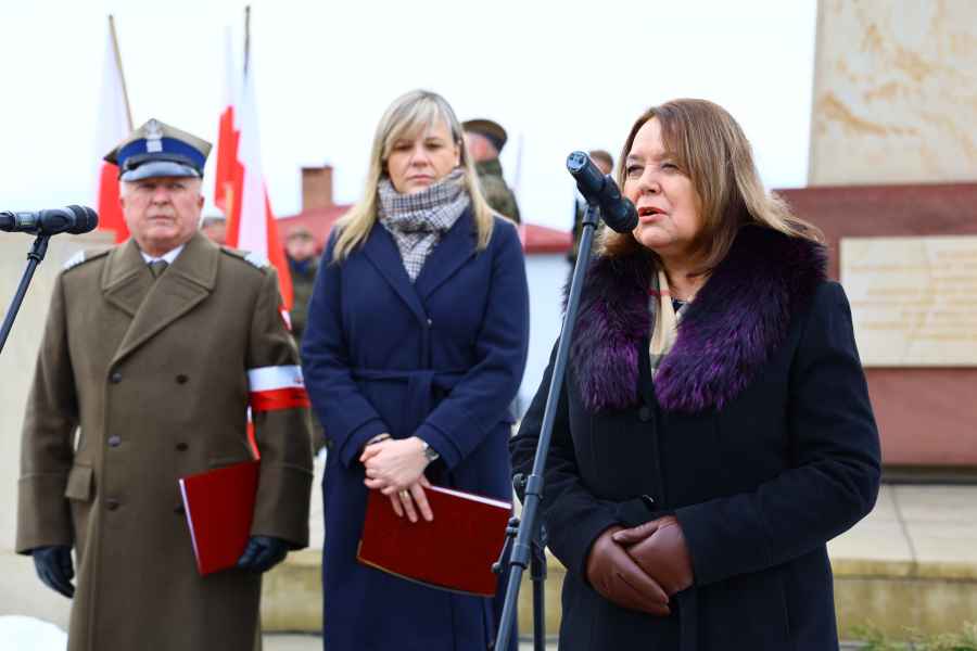 Wicestarosta Zenon Swatek, starosta Barbara Broź oraz Członek Zarządu Powiatu Józef Ozimek składają kwiaty pod pomnikiem w Lubaczowie fot. Powiat Lubaczowski