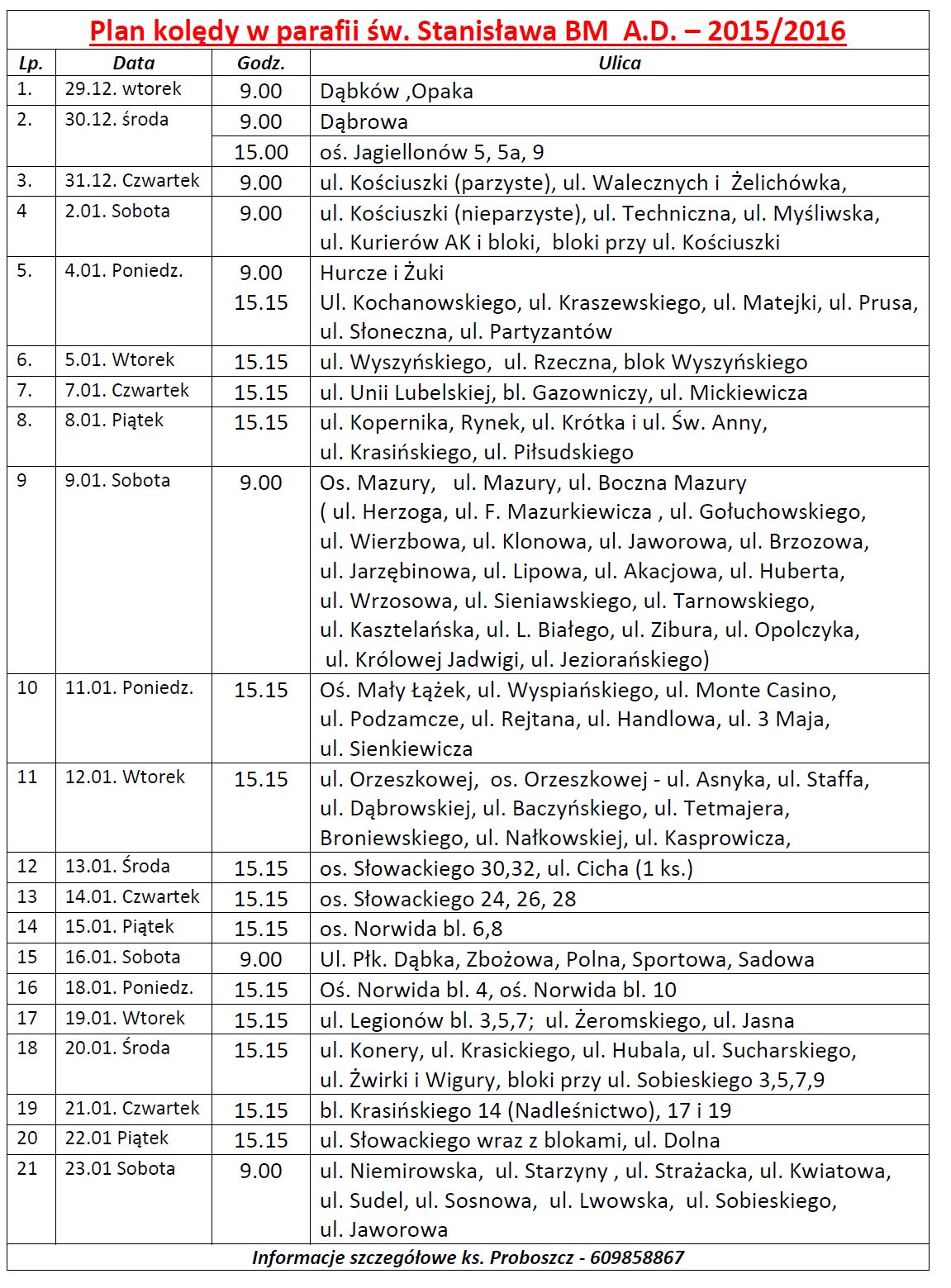 Środa 13.01 – od godz. 15.30 Osiedle Dąbrowskiego i kolęda dodatkowa