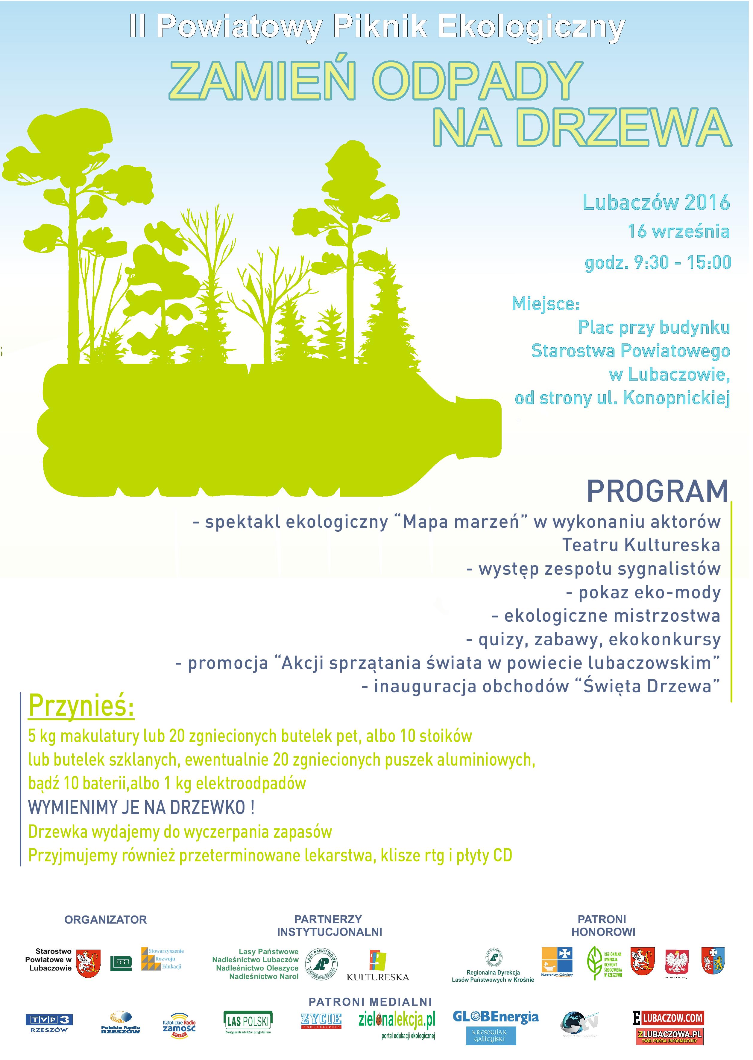 Pokazy eko-mody, konkurs eko-piosenki, warsztaty, zabawy i eko- konkursy to tylko część atrakcji II Powiatowego Pikniku Ekologicznego w Lubaczowie pod hasłem ZAMIEŃ ODPADY NA DRZEWA LUBACZÓW 2016, który odbędzie się w piątek o godzinie 8:30.