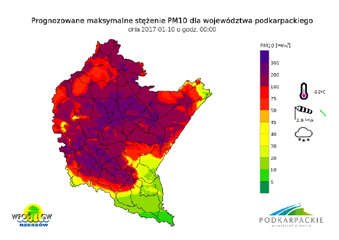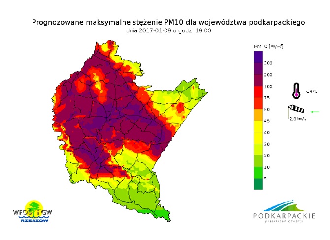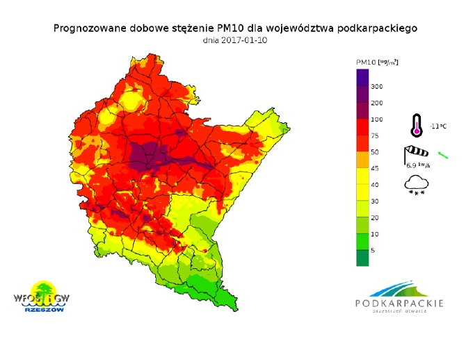 Dostępne prognozy zanieczyszczenia powietrza pyłem PM10 oraz prognozy meteorologiczne na kolejne dni wskazują jednak na możliwość występowania wysokich wartości tego zanieczyszczenia w powietrzu na większości obszaru województwa podkarpackiego. Prognozy można obserwować na stronie: http://powietrze.podkarpackie.pl/