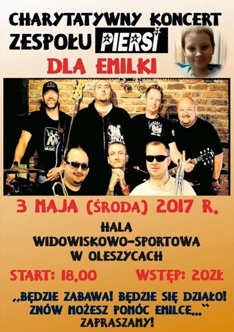 Już za niecały miesiąc na hali widowiskowo-sportowej w Oleszycach odbędzie się charytatywny koncert zespołu Piersi. Fundusze zebrane podczas koncertu i sprzedaży biletów przekazane zostaną na leczenie Emilki Jasic z Oleszyc.