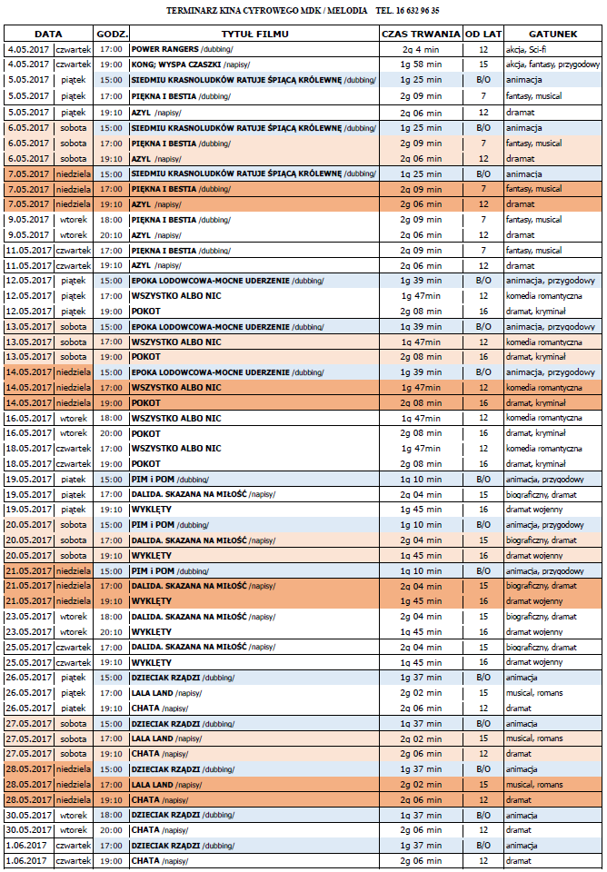 W maju w lubaczowskim kinie "Melodia" będzie co oglądać: Power Rangers, Kong: Wyspa Czaszki, Siedmiu krasnoludków ratuje Śpiącą Królewną, Piękna i Bestia, Azyl, Epoka Lodowcowa - Mocne uderzenie, Wszystko albo nic, Pokot, PIM i POM, Dalida. Skazana na miłość, Wyklęty, Dzieciak rządzi, LALA LAND, oraz Chata.