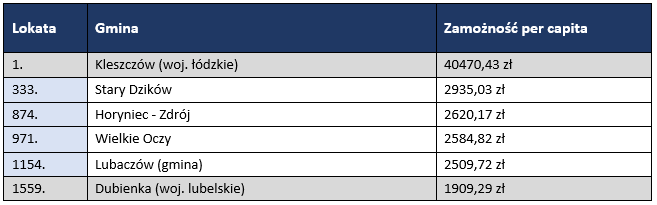 Od kilkunastu lat magazyn „Wspólnota” przygotowuje rankingi finansowe, m.in. dotyczące wydatków na inwestycje i poziomu zamożności w przeliczeniu na jednego mieszkańca. Dochody poszczególnych samorządów w roku 2016, podobnie jak w latach wcześniejszych, zostały podzielone przez liczbę mieszkańców gminy. W Polsce są tylko 43 gminy, których dochody według wskaźnika używanego w rankingu przekraczają 5000 zł na mieszkańca.