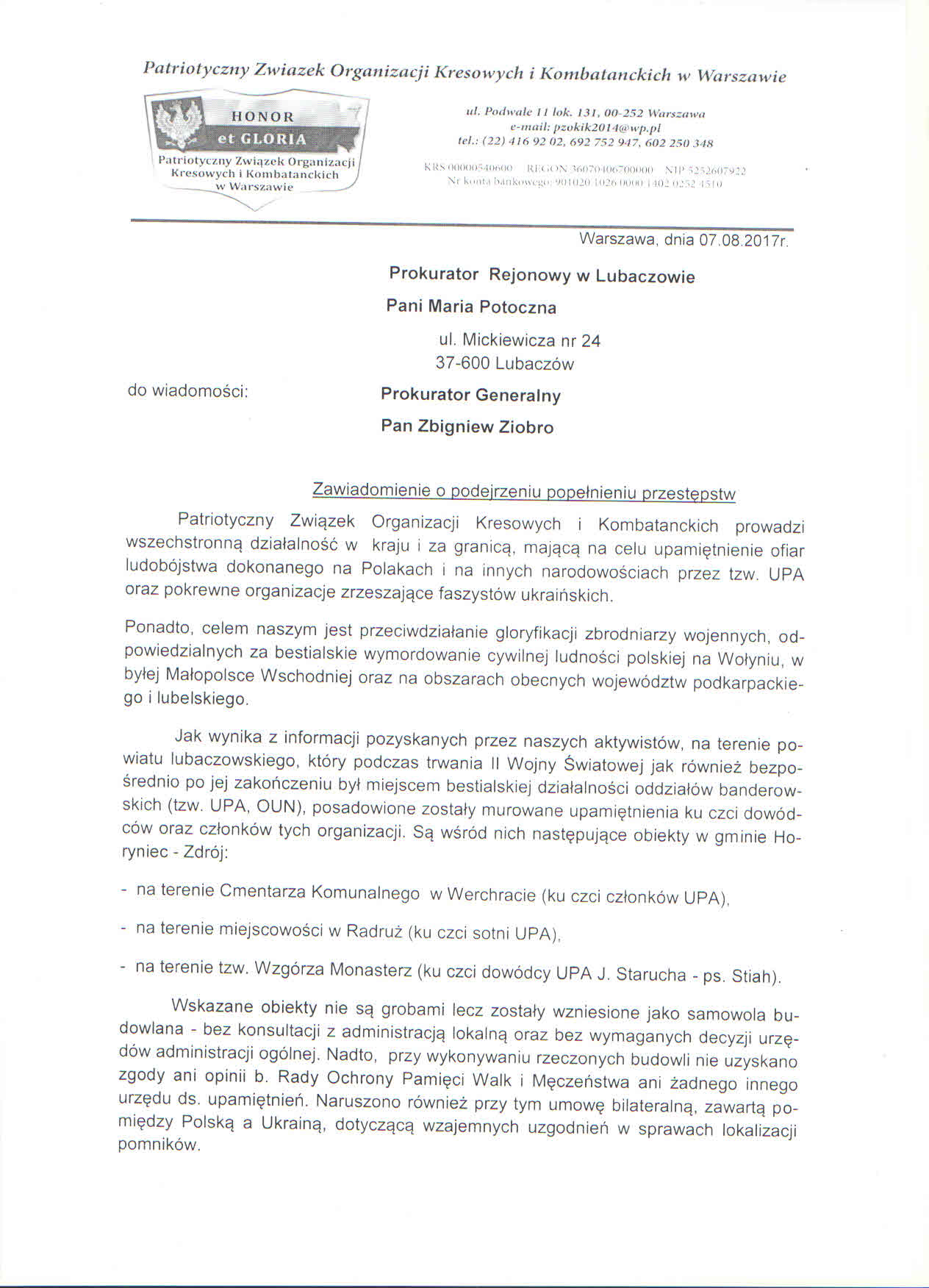 Patriotyczny Związek Organizacji Kresowych i Kombatanckich zwrócił się do Prokuratora Generalnego Zbigniewa Ziobro o interwencję w sprawie nielegalnie wzniesionych na terenie powiatu lubaczowskiego pomników ku czci banderowskich ludobójców. – informuje portal prawy.pl
