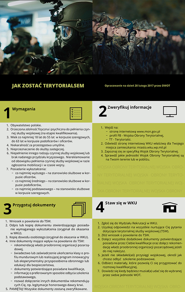 Punkty promocyjno - informacyjne będą przyjmować wnioski do WOT w godzinach od 10:00 do 17:00. Zainteresowane osoby będą mogły złożyć wniosek w punktach. Do wniosków należy dołączyć następujące kserokopie dokumentów: świadectwo ukończenia szkoły, dowód osobisty, prawo jazdy, oraz inne potwierdzające posiadane kwalifikacje