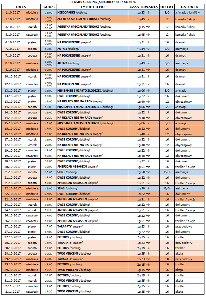 W październiku w lubaczowskim kinie "Melodia" będzie co oglądać: Na pokuszenie, Auta 3, Miś Bamse i Miasto Złodziei, Dwie Korony, Na układy nie ma rady, American Assassin, Sing, Tarapty, Twój Vincent oraz przez wielu wyczekiwany, ale zbierający nieprzychylne opinie: Botoks.